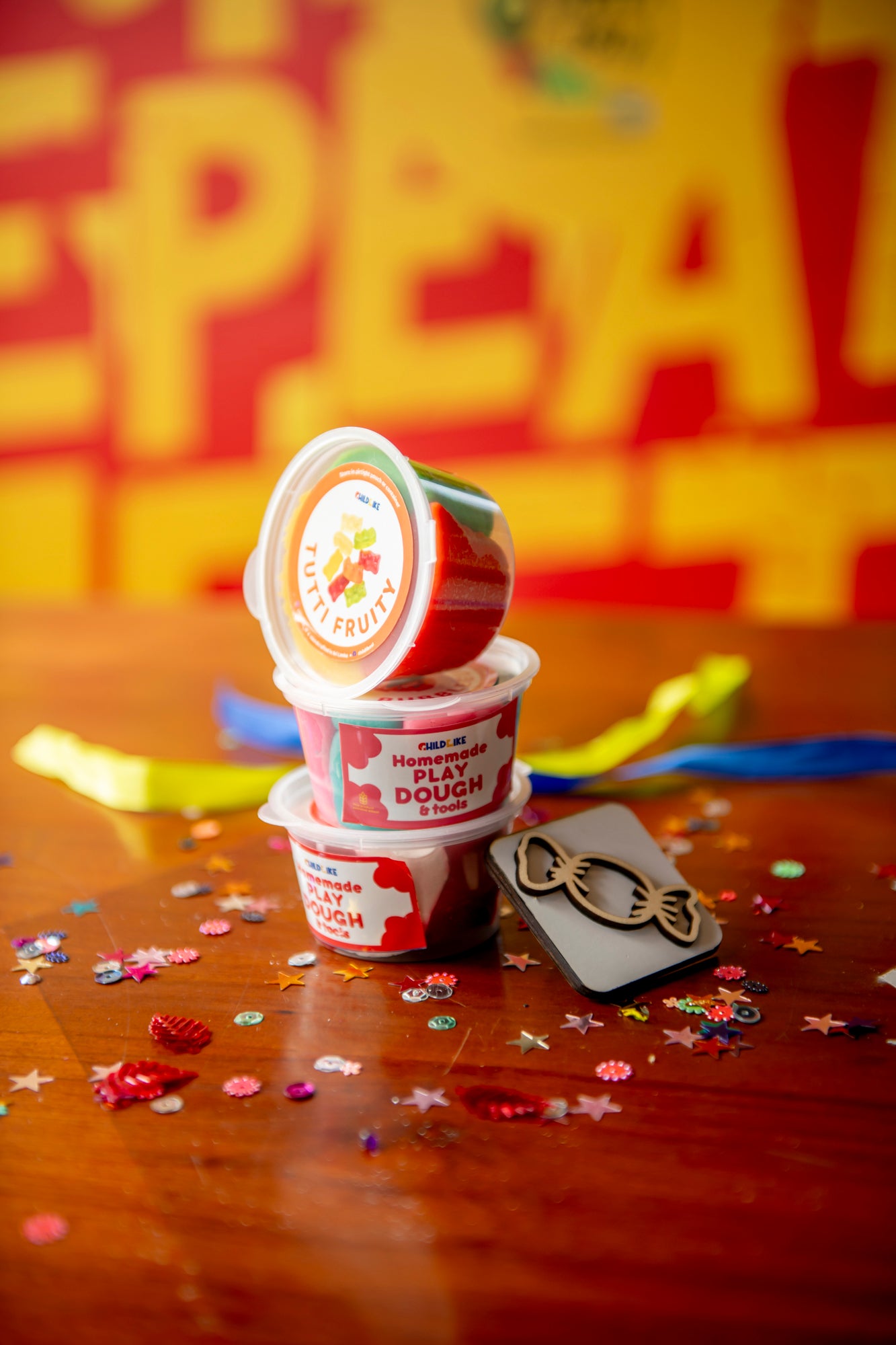 This Play dough Candy set includes 80g of homemade dough in 3 flavors: Bubblegum, Tuttifruit, and Peppermint, along with a special candy stamp.